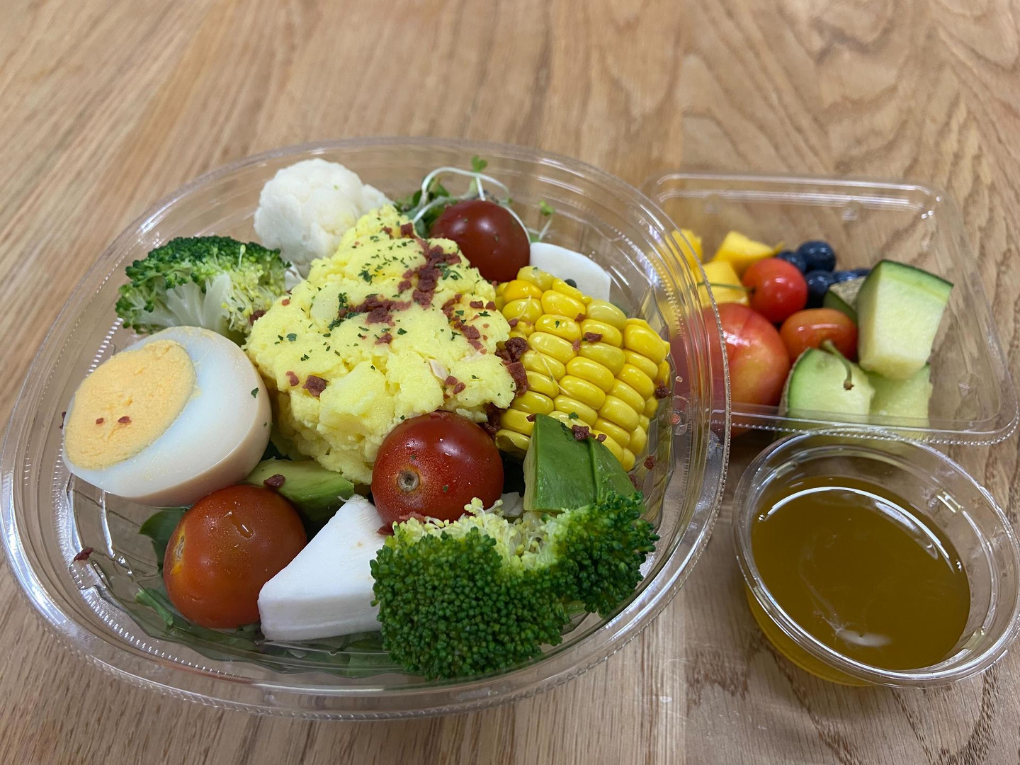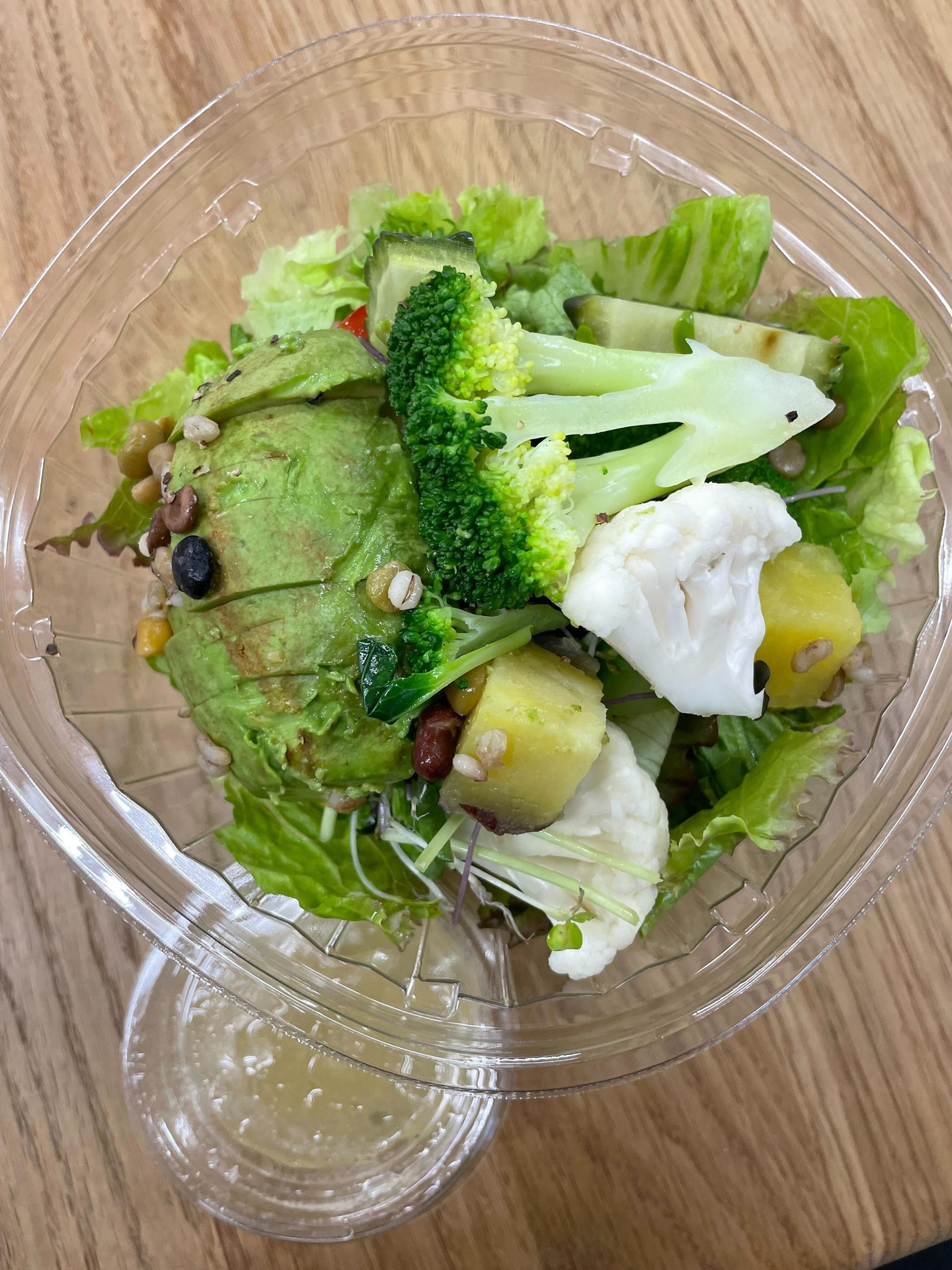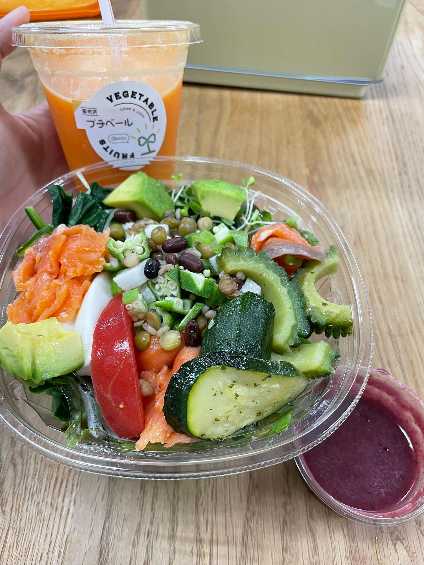 Wさんチョイス。腸活サラダ。 ピオーネドレッシング(!)。季節の柑橘ジュース。(スムージーやジュースも購入できます。)