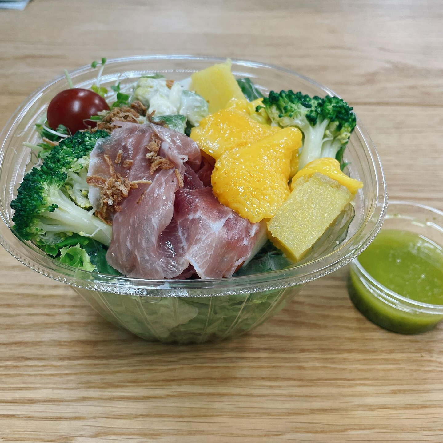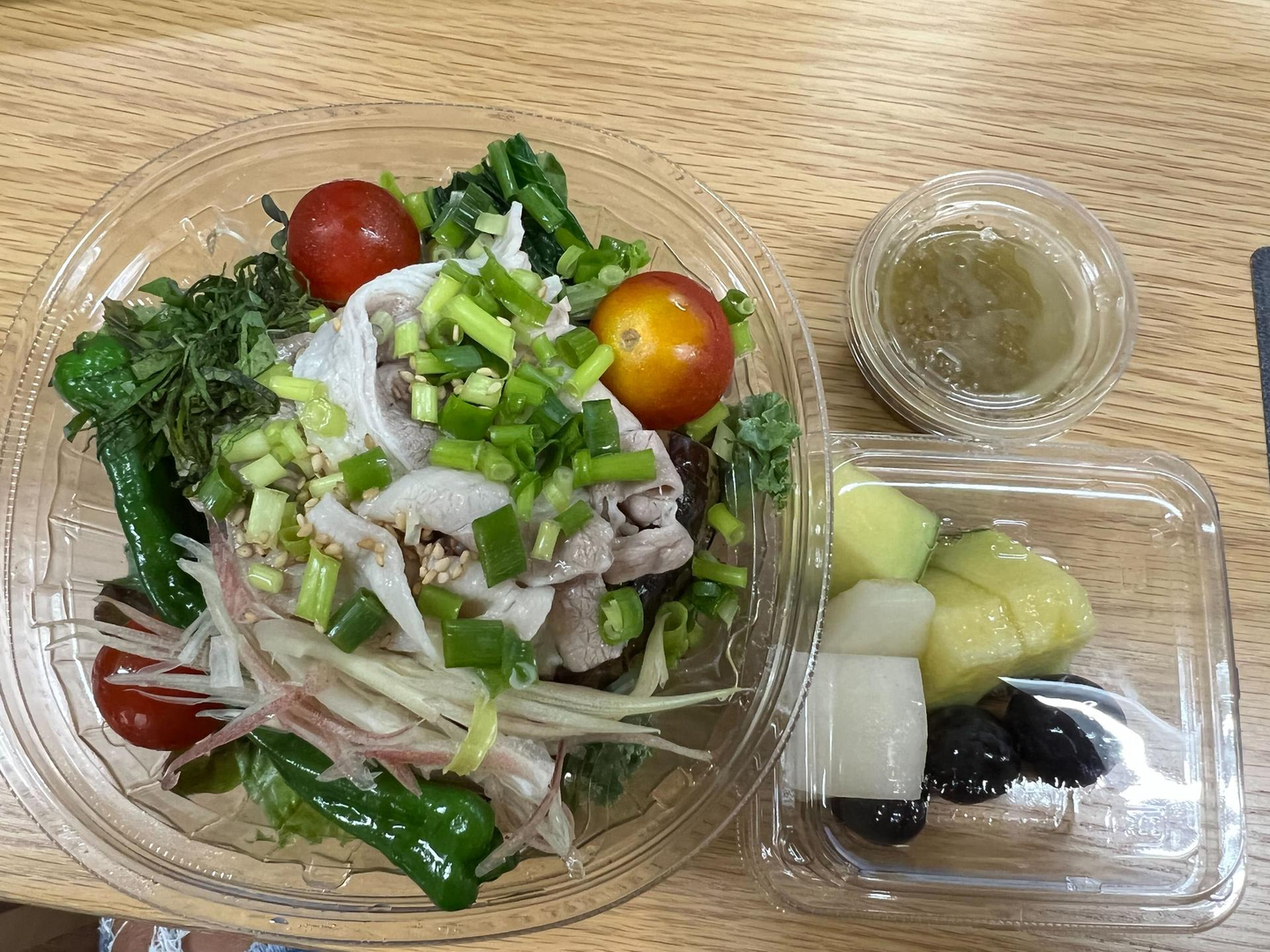 Hさんチョイス。豚しゃぶのサラダ。玉ねぎときのこのドレッシング。(カットフルーツも購入できます)