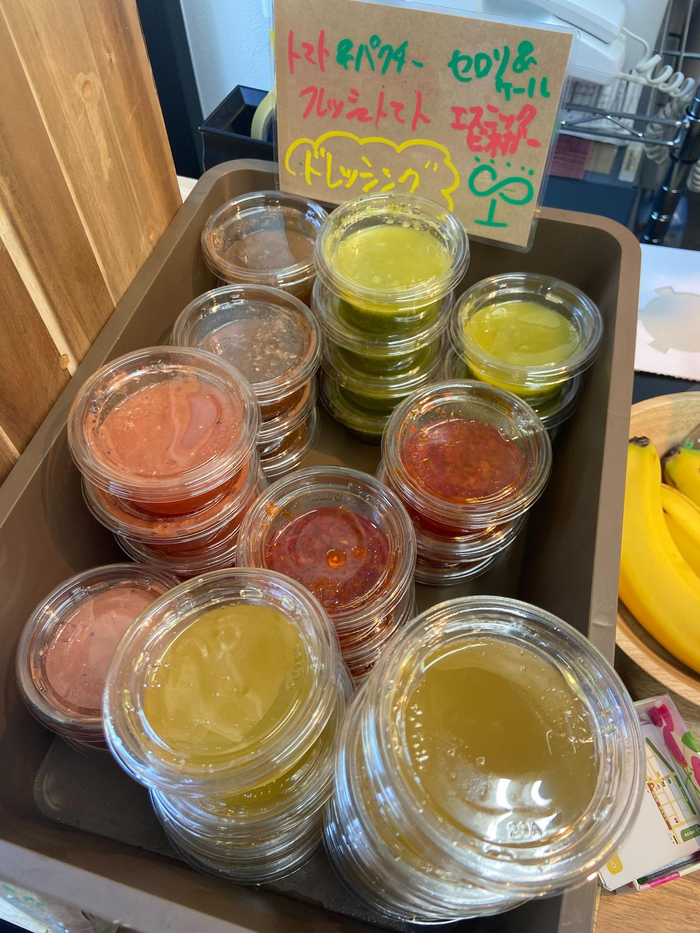 サラダのラインナップは入荷状況によって変わるので、季節の変化を楽しめます。それから個人的に推しなのが、ドレッシングです。こちらもお店の野菜や果物を使った八百屋さんならではのフレッシュなものが多く、ほかではあまり見ない組み合わせがあることも。私がはまっているのはトマト&パクチーです。