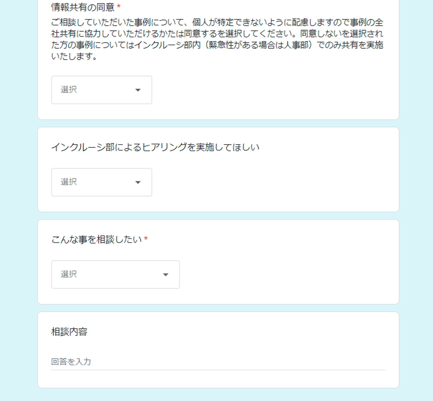 最初に、個人を特定できない形で社内で公開してよいかどうか、という設問があります。こういうことでもやもやを感じる人がいるんだな、ということをまずは知ってもらうことが大事だと思うからです。共有に同意しない場合はインクルーシ部内(緊急性が高い場合は人事部)で共有されます。