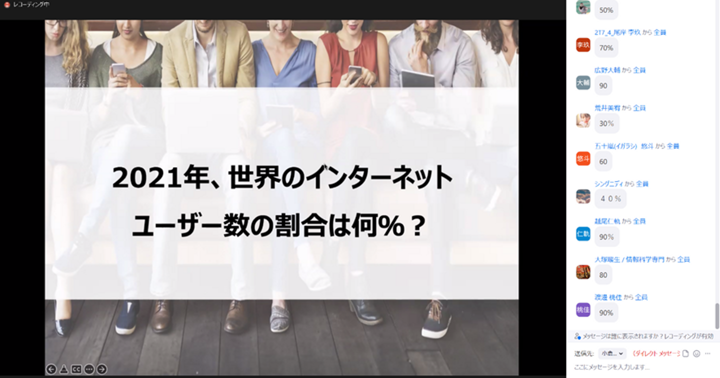 弊社で用意した質問に対し、学生にチャットを使って回答していただく方式を実施した結果、回答殺到!学生の皆様、ご協力ありがとうございました!
