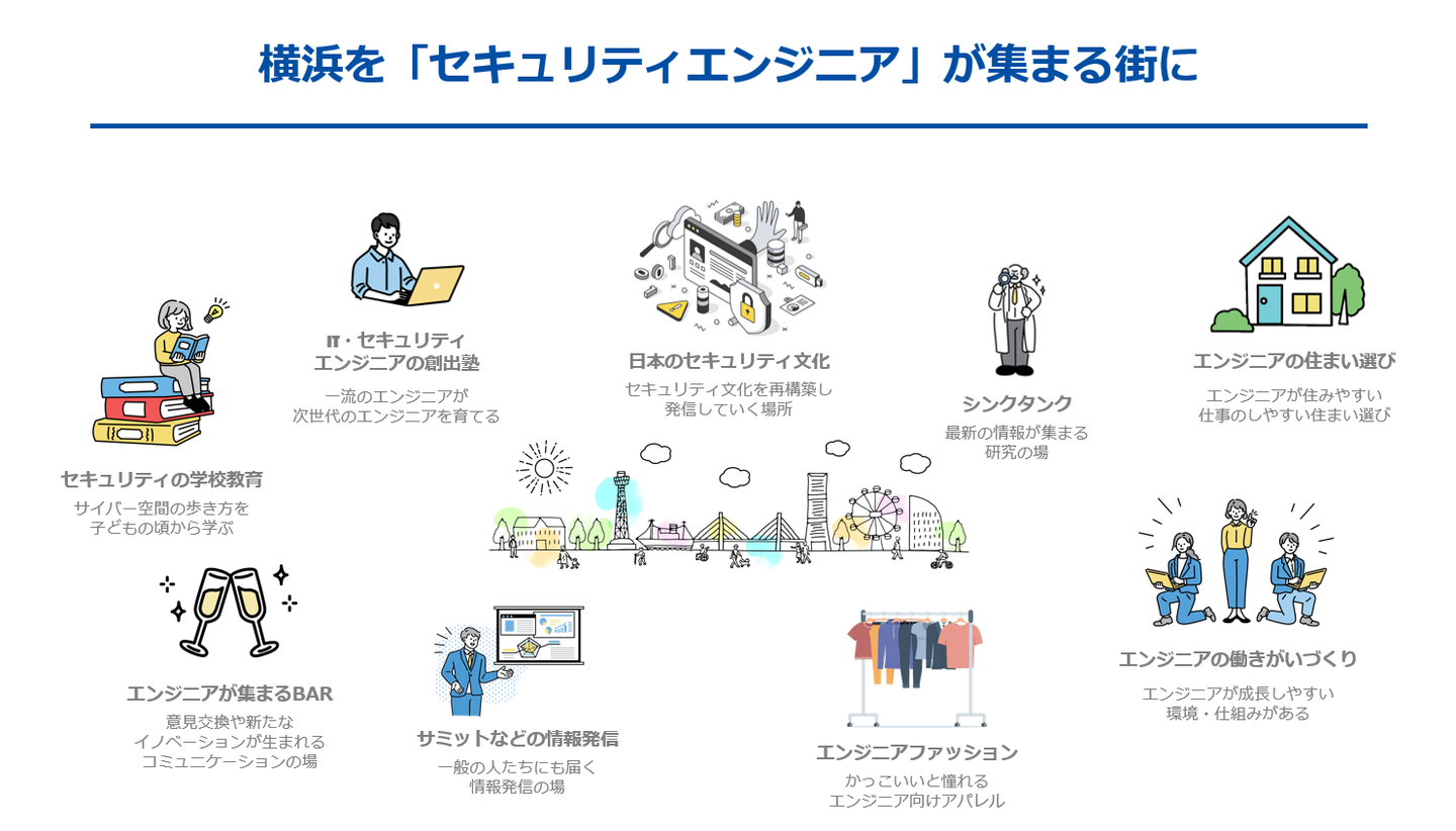 その結果、「なぜか横浜にセキュリティエンジニアが集まる」「なぜか世界中から横浜にセキュリティ技術の視察が来る」そんな横浜の街になると信じています。