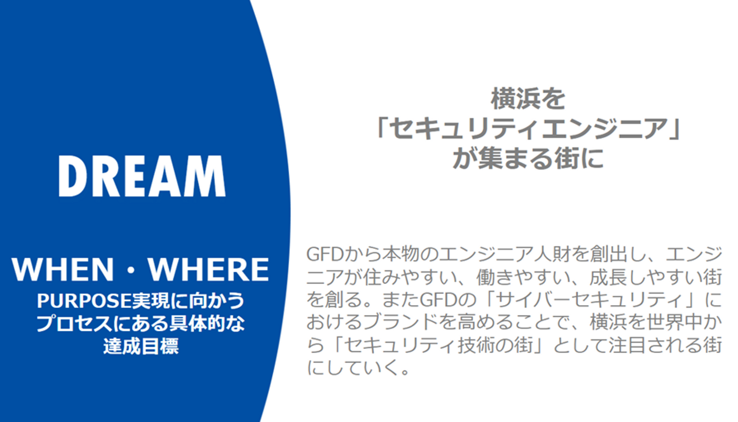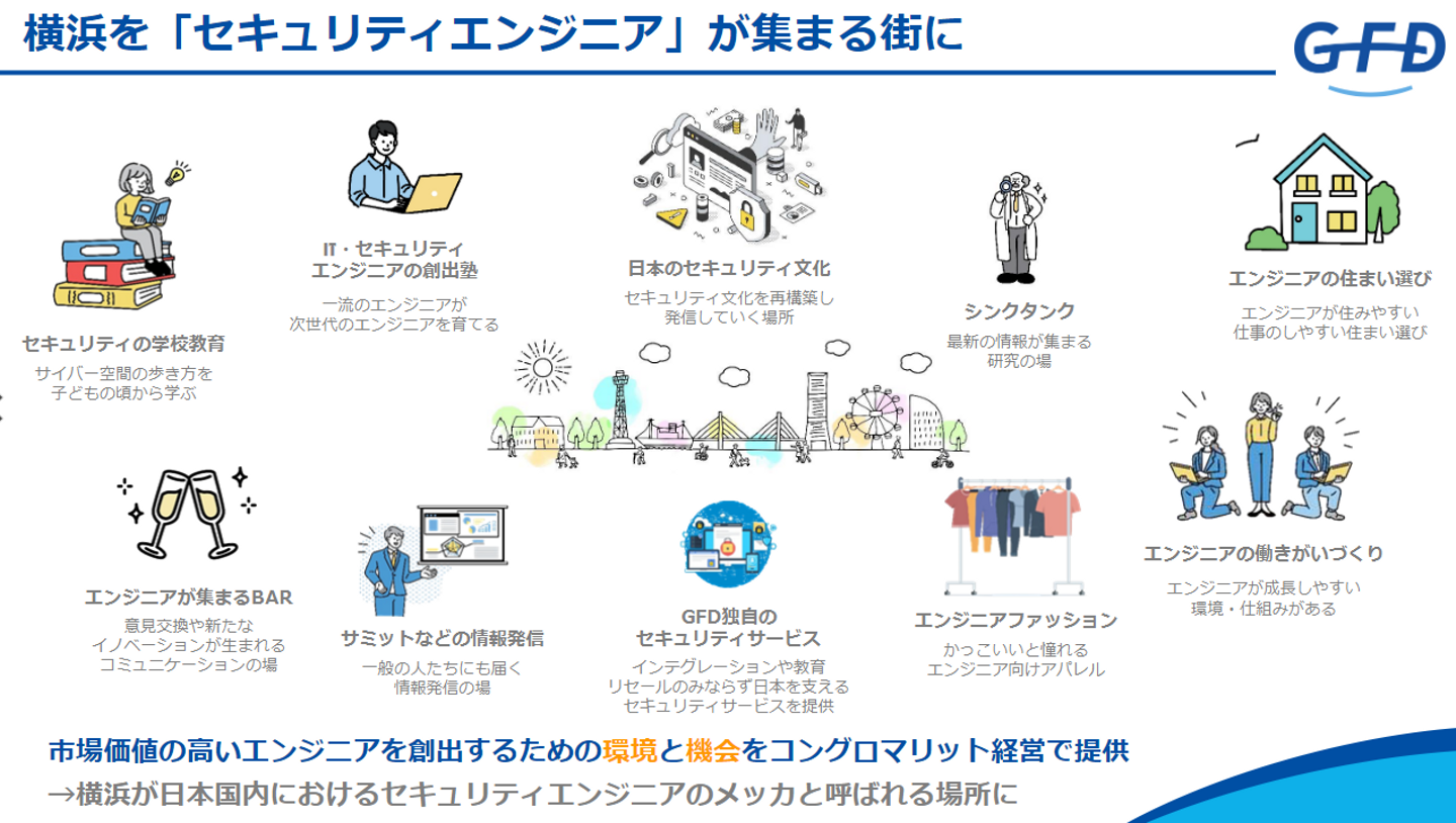 GFDから本物のエンジニア人財を創出し、エンジニアが住みやすい、働きやすい、成長しやすい街を創る。またGFDの「サイバーセキュリティ」におけるブランドを高めることで、横浜を世界中から「セキュリティ技術の街」として注目される街にしていく。