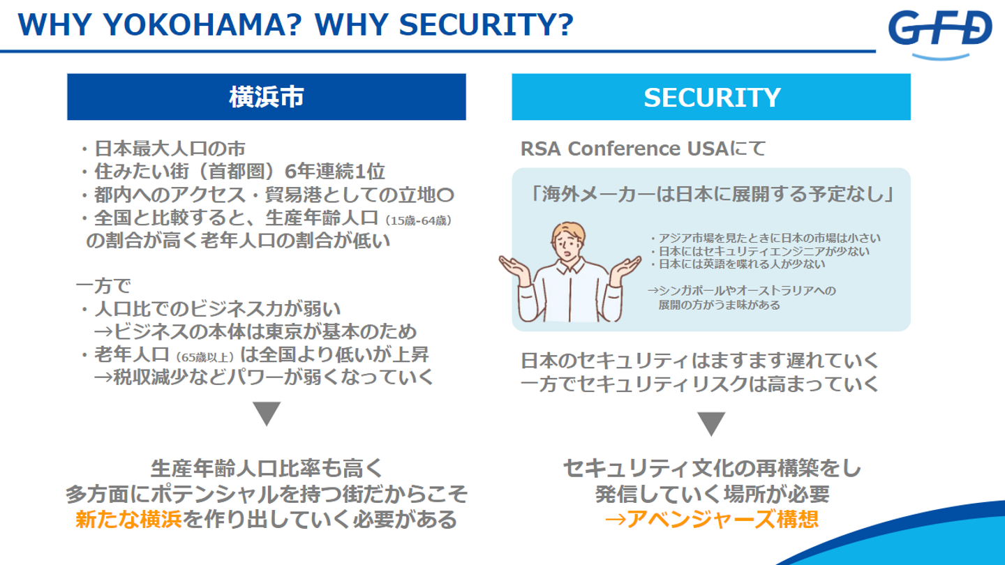 この現状変えるために、GFDでは自分たちが強みとして扱っているセキュリティ技術や知識を横浜から発信し、世の中のセキュリティ感度を高め、日本のセキュリティ文化を再構築していこうと考えています。その結果、GFDのセキュリティブランドが確立、