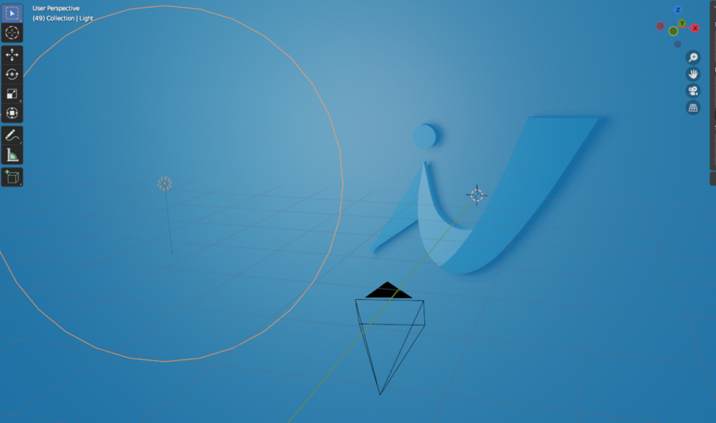 3Dソフト「Blender」編集画面。オレンジの円が球状のライト。