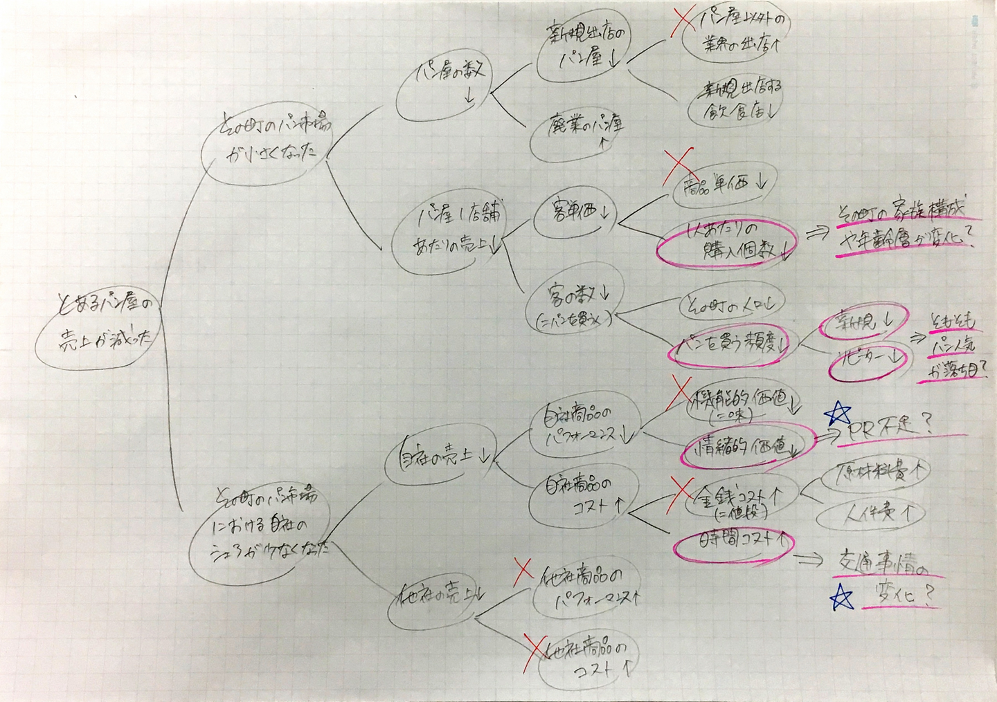 例えばクライアントから今回のように「パン屋の売り上げが下がった原因を特定してくれない?」という依頼があったとします。直感だと、「競合店の出店」や「品質の低下」などありふれた回答をしてしまいがちになります。ただ、今回のようにツリーを用いることによって発想を広げることができ、結果、多くの選択肢を検討することができます。問題の再上流から論理的に原因を因数分解していくことで、3Cや4P等の既出のフレームワークではでてこないようなアイデアが導き出されます。