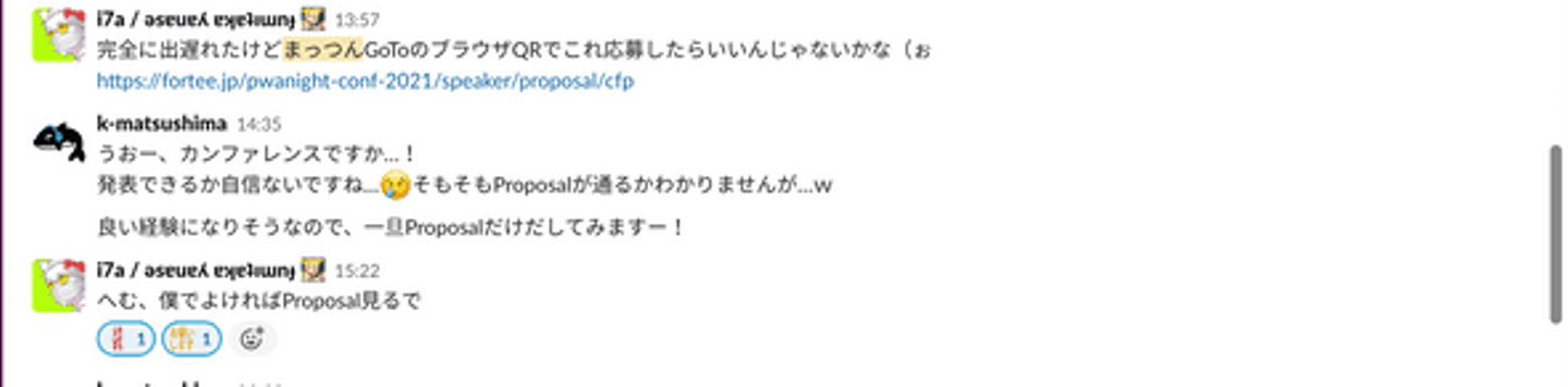 作成したCFPをSlackで展開したところ、「やるわ」リアクションをたくさんもらえたので少し自信が付きました。(これも弊社の良い文化)