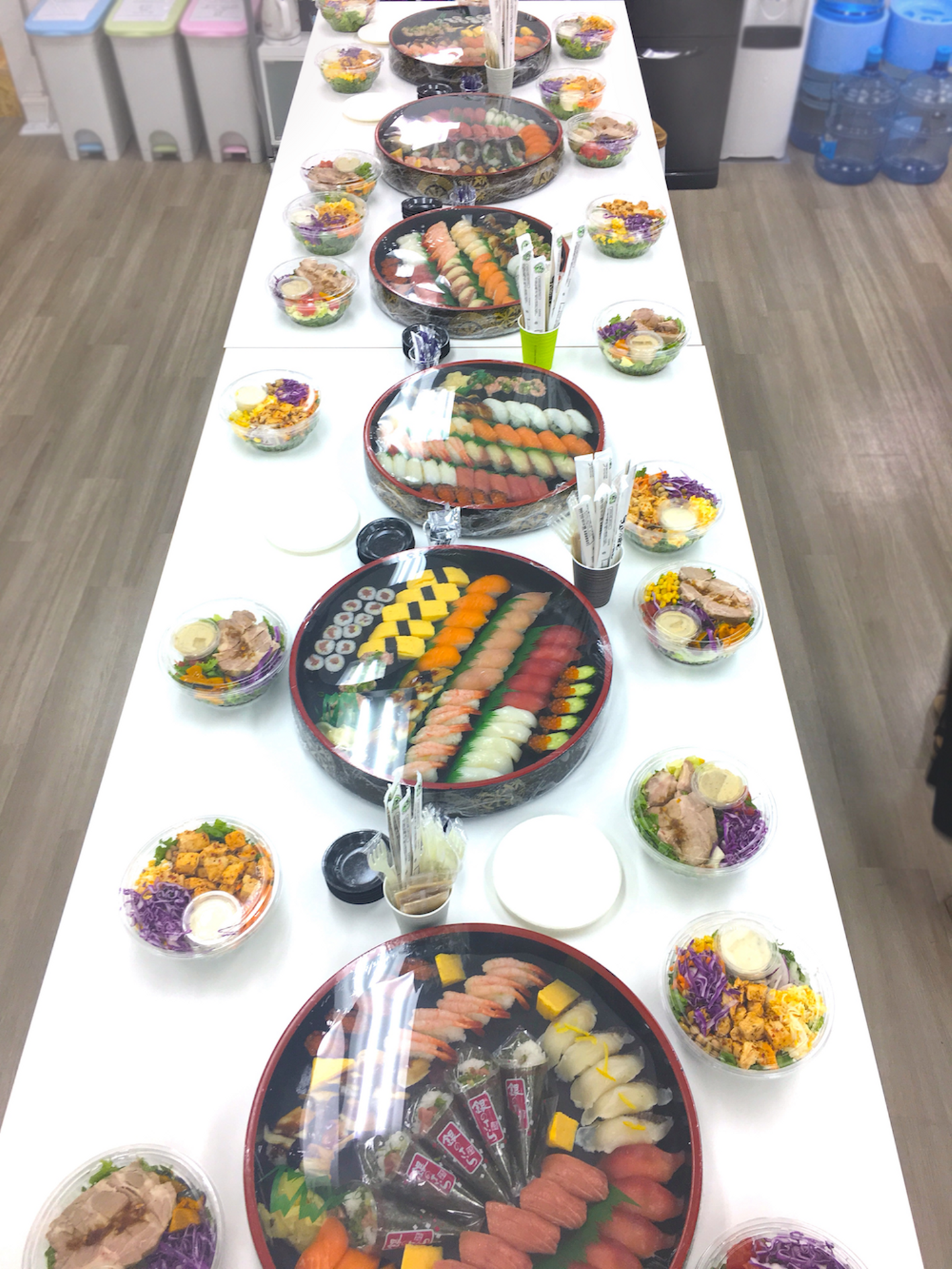 じゃーん!今回のケータリングは、お寿司とサラダです。毎回、色々なメニューでパーティーを彩ます。次のパーティーは何かなぁと今から楽しみ。