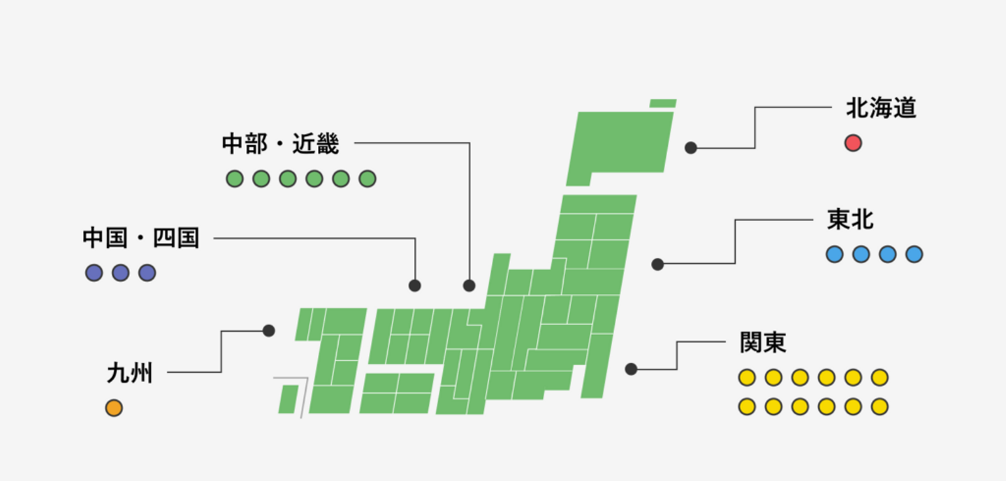 関東が多いものの、北海道から九州までバラバラですね!
