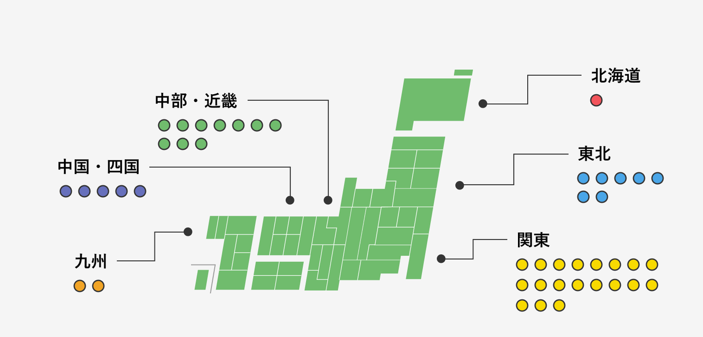 関東が多めではあるものの、北海道から九州まで日本全国から集まっています。