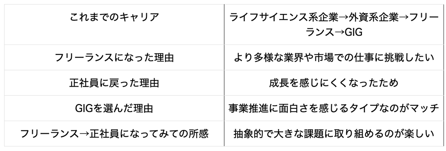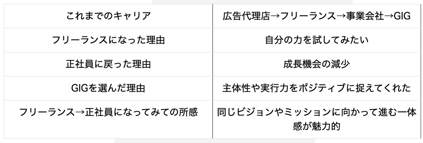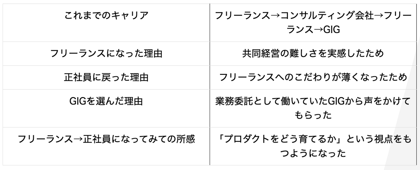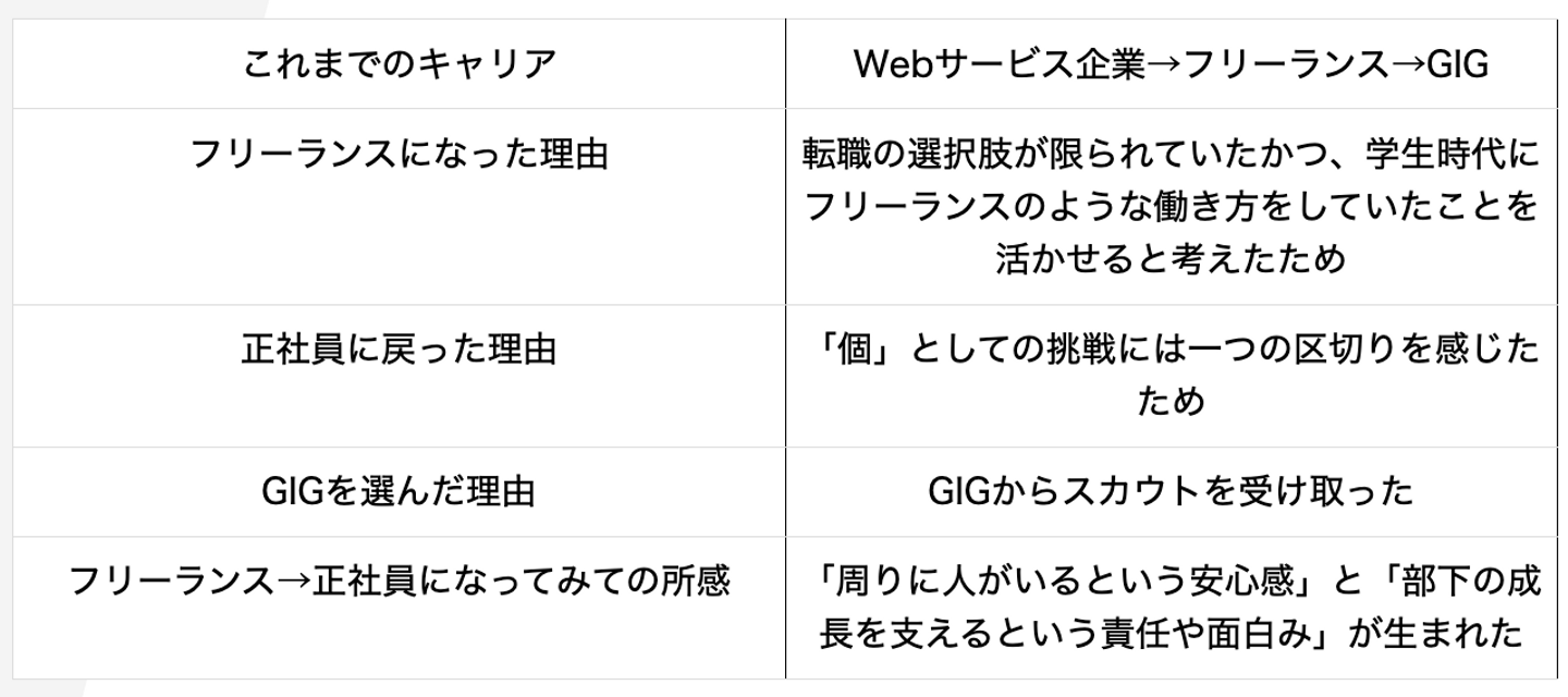 フリーランスからGIGに正社員として入社した4名のストーリーを通じて、個々がどのようにキャリアを選んできたのか実例を通じてご紹介します。