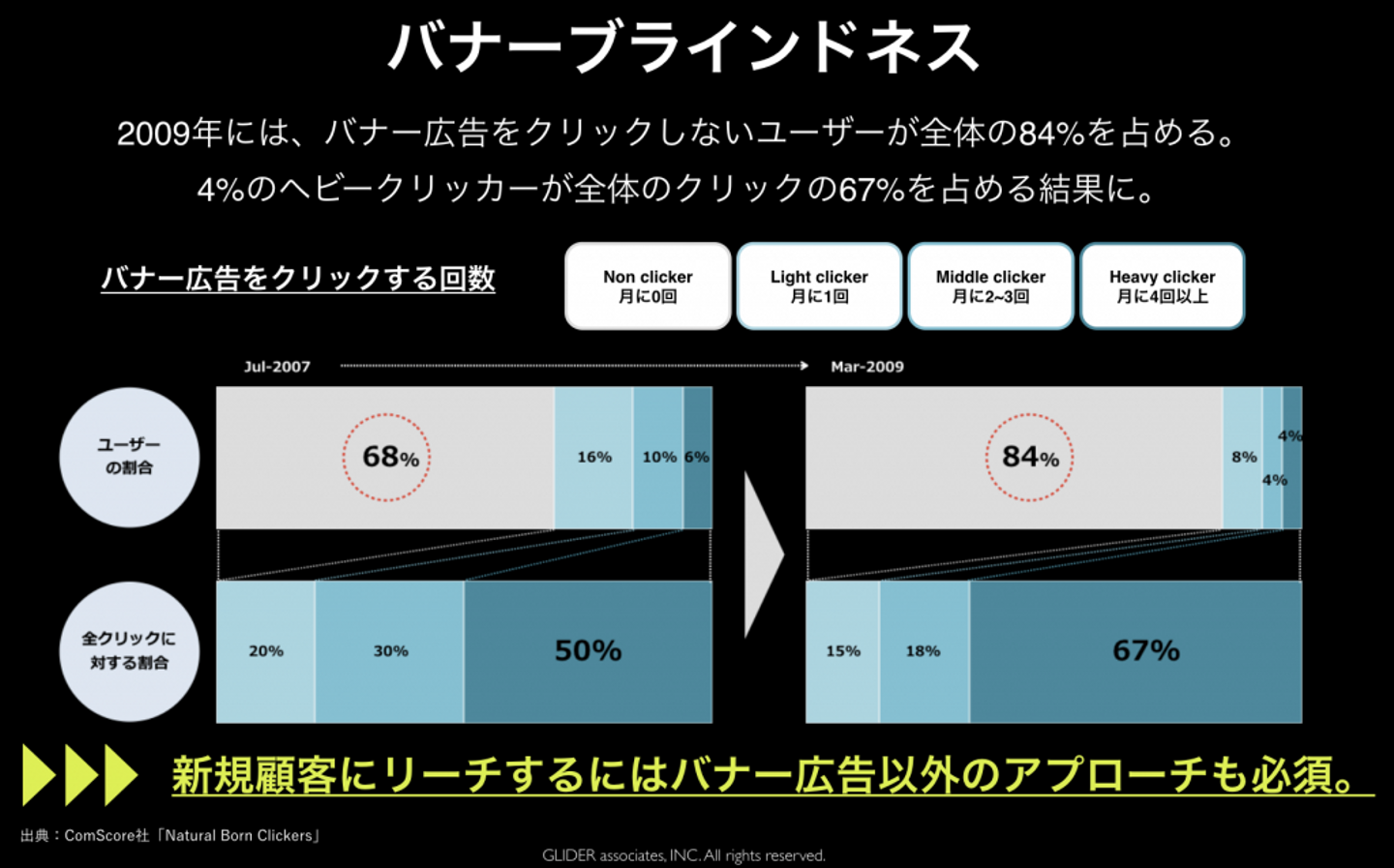 画像をみると、2009年にはバナーを1度もクリックしない人が84%もいることがわかります。また、4%のヘビークリッカーによってクリックされる広告は、全体の67%にものぼります。