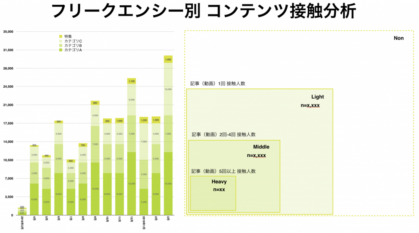 ペルソナに応じてコンテンツを変える必要があり、これらをカテゴリ(A、B、C)として分けたとします。それぞれのカテゴリに、どのような人が接触したかをデータとしてまとめたものが上のグラフです。