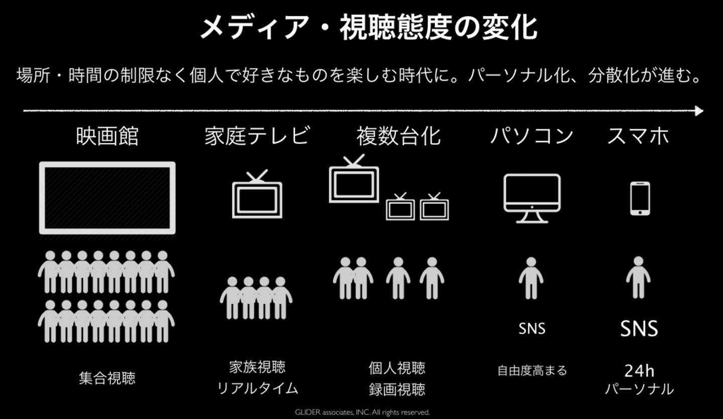 これまで、コンテンツを閲覧する行為はメディアによって成り立っていました。しかし、時代の流れの中でパーソナル化・分散化が進み、場所・時間の制限なく個人で好きなものを楽しむよう変化しています。