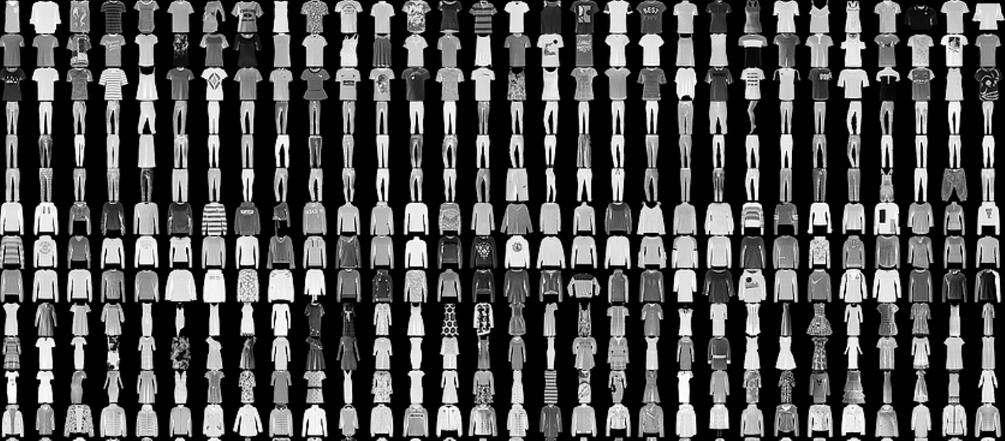 次に、今回機械学習で用いるデータセットのFashion MNIST dataset(10のカテゴリに分けられた70,000の28x28ピクセルイメージのデータセット)をインポートします。Fashion MNIST datasetは上のようにファッションに関するアイテムの画像データの集まりです。