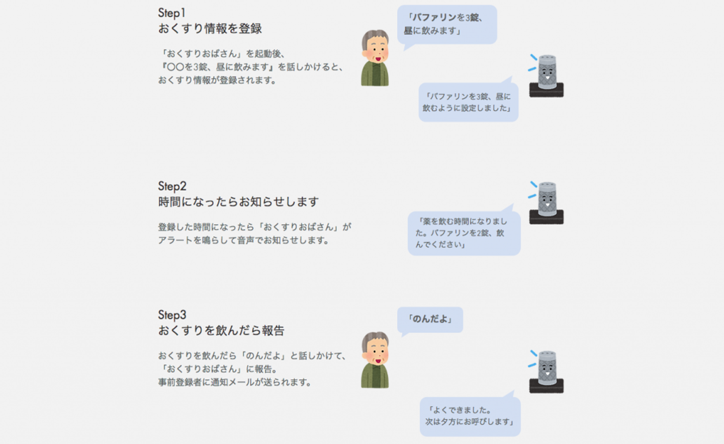 あっきー:まずは僕が開発を担当した『おくすりおばさん』ですね。人って、歳をとるとどんどん物忘れするようになっていくじゃないですか。なのに、飲む薬はどんどん増えていきますよね。そこで便利なのがこのスキルです。Alexaにあらかじめ「薬を飲む時間」「飲む薬の種類」「薬の錠数」を登録しておくことで、指定の時間になったらAlexaが薬のリマインドをしてくれるものです。またLINEと連携して、娘夫婦に連絡を入れるシステムも考ました。