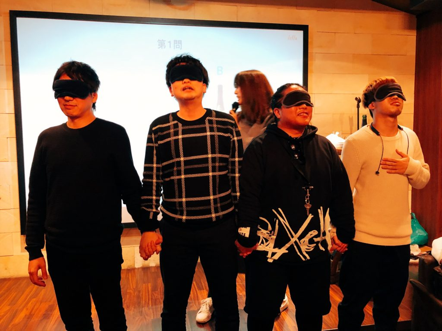 目隠しをしたところ、なぜか手を繋ぎ始める4人。人は暗闇にとらわれると、誰かと触れ合いたくなるものなのです。決してそういう関係が出来上がっているわけではないのです。