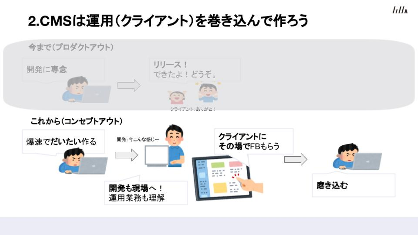 氏江:「CMSは従来、開発者は開発に専念して、完成したらお客さんに運用してもらう流れが一般的でした。しかし、今回行なったのはコンセプトアウトの考え方に基づいたCMS開発。社内メンバーだけでなく、運用するクライアントにも開発初期から入ってもらいました」