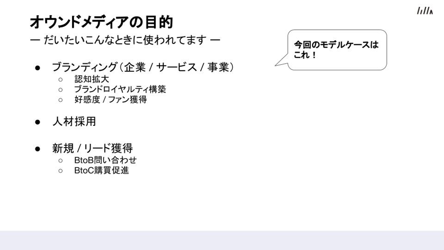 今回のモデルケースはオウンドメディア。オウンドメディアの特徴や目的について詳しく説明してくれました。
