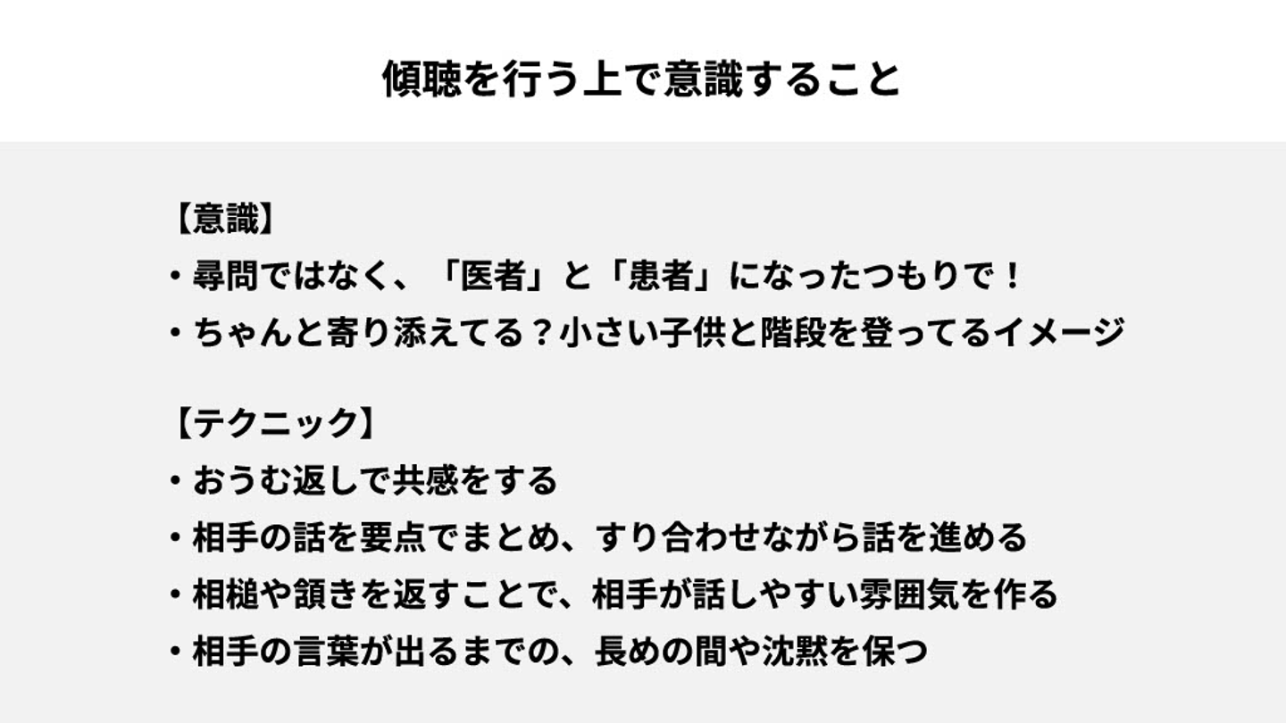 おうむ返しで共感したり、相手の話の要点をまとめ、すり合わせながら話を進めるなど、これらは傾聴する上で重要なテクニックです。