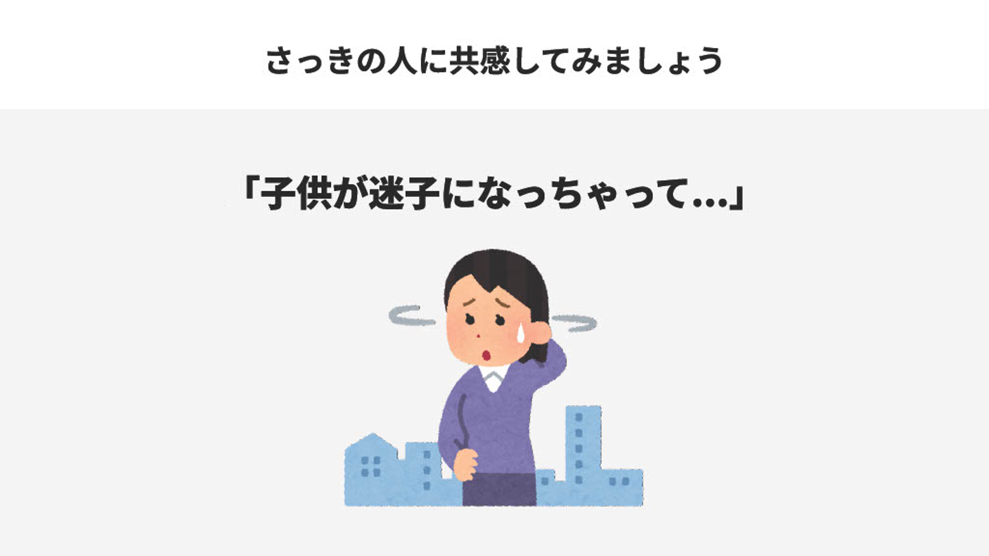 次のステップは、相手への共感です。先ほどの女性が、迷子の子供を探している状況とした上で、共感してみてください。