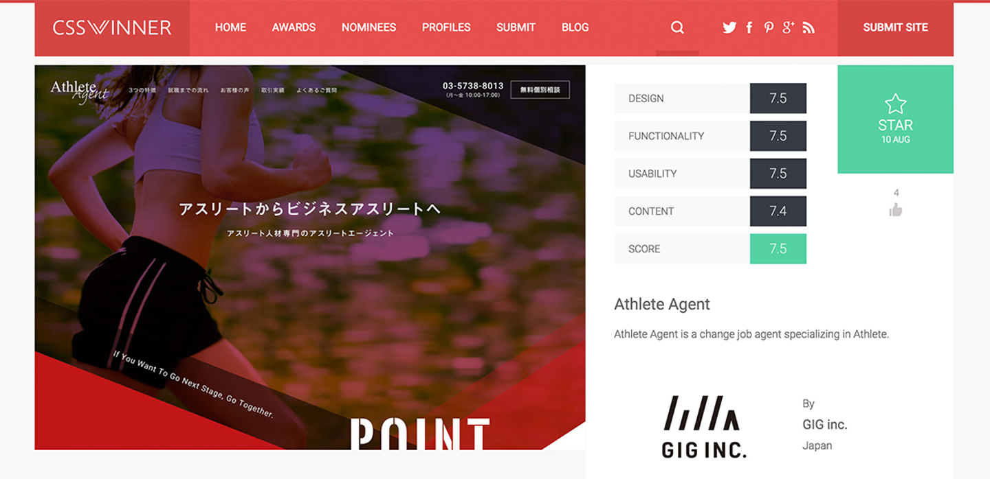 こんにちは。GIG広報担当の古性 のちです。先日、GIGで制作を担当したAthlete Agentさまのランディングページが、DAA、そしてCSS WINNERに選出されました!