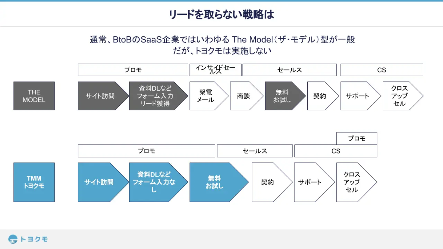 現在、SaaS系企業の多くはTHE MODEL型で、リードを獲得し、インサイドセールスが見込み顧客にメールや電話でアプローチを行うといった戦略をとっていると思いますが、2年ほど前から弊社は顧客目線をさらに重視したマーケティング戦略へシフトしたんです。