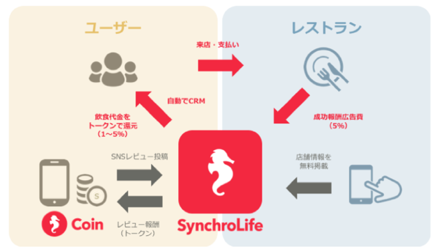 世界で初めて、食レビューで暗号通貨がもらえる報酬制度を搭載し、食レビューの民主化を目指しています。またシンクロライフ加盟店での飲食代金からも暗号通貨が還元されます。飲食店にはリスクゼロでプラットフォームを解放し、飲食業界のマーケティング課題にも取り組んでおります。
