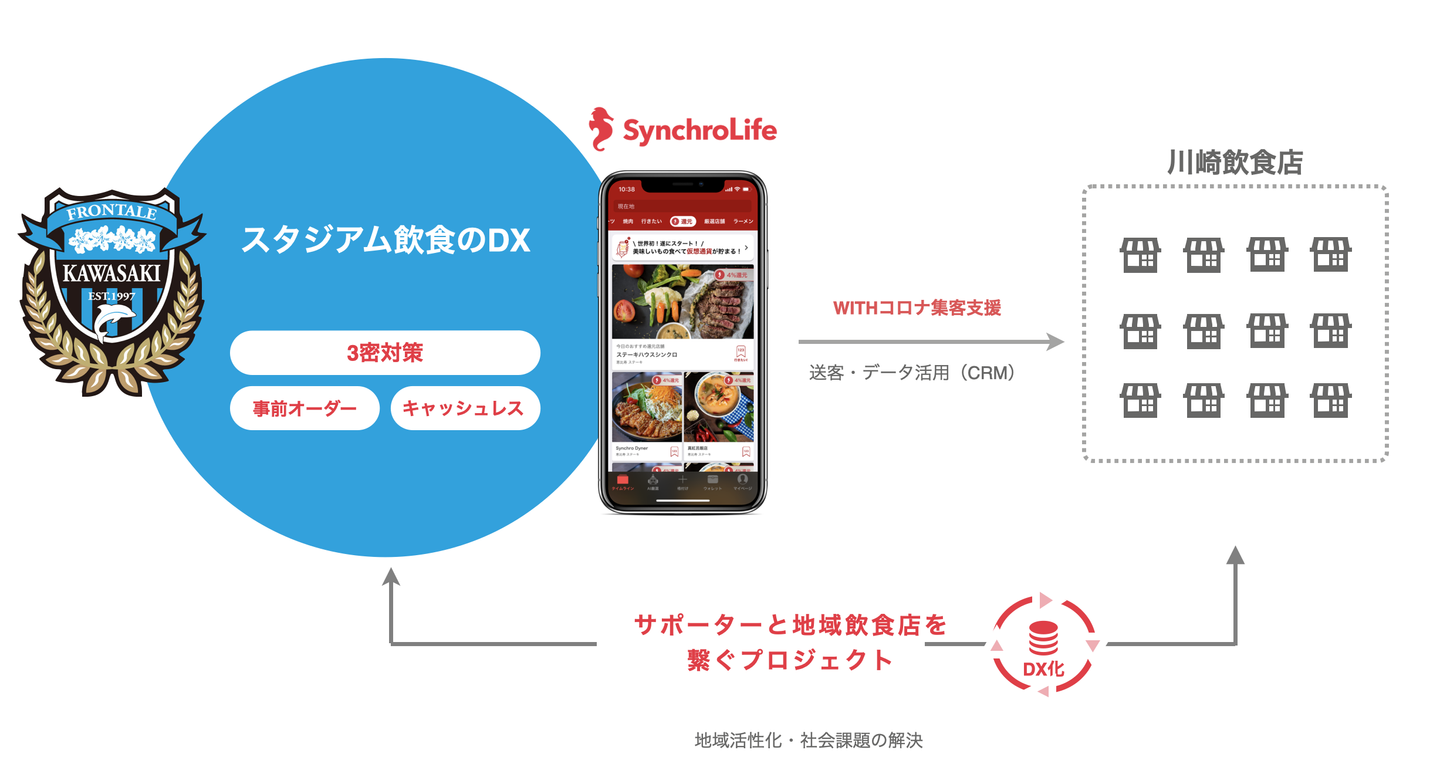 「シンクロライフ」アプリのモバイルオーダー及びブロックチェーンを活用した暗号通貨ポイントシステムを通して、川崎フロンターレのスタジアム内の飲食店と、川崎地域の地元飲食店のマーケティング領域におけるデジタルトランスフォーメーションを推進します。具体的には、モバイルオーダーによる混雑回避、キャッシュレス推進、試合結果に応じた、来店インセンティブ付与による地元飲食店集客への寄与を目指すことです。これにより、With/Afterコロナ時代における安心・安全なスタジアム運営と、地域経済の活性化を実現します。