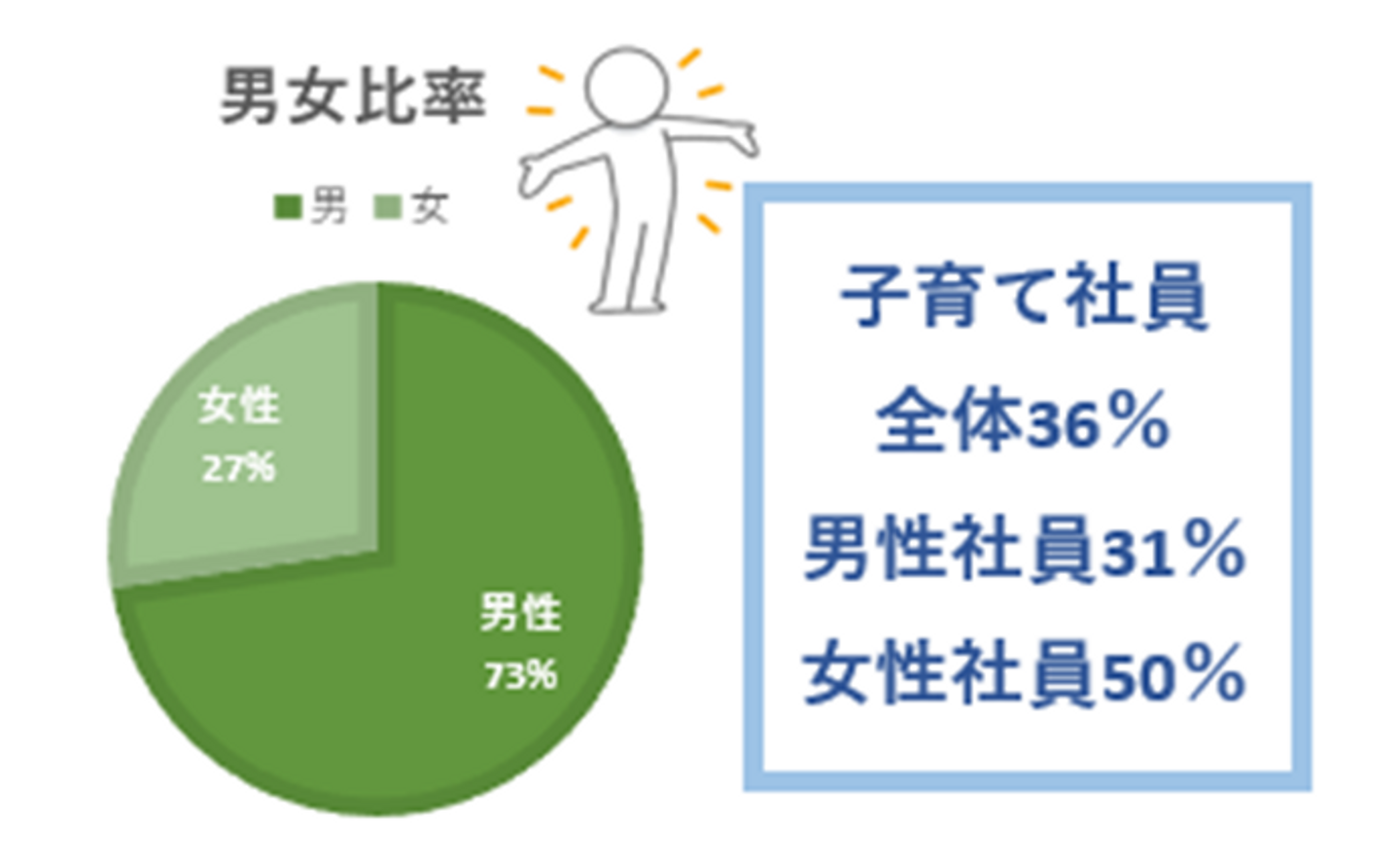 ヒラソルの特徴の1つとして、男女関係なく子育て社員が約36%も在籍しています。