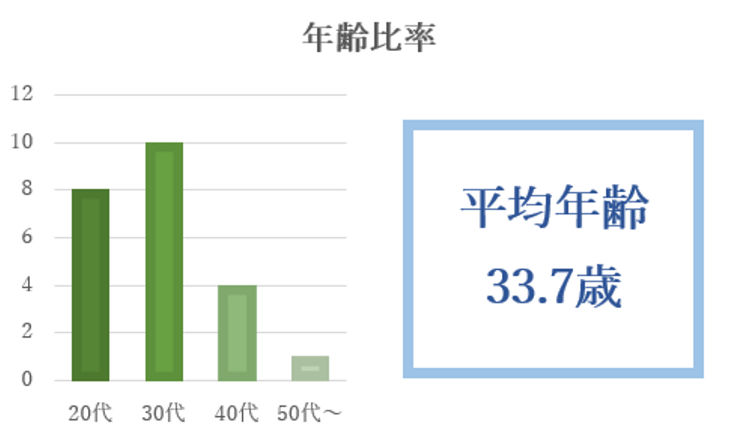 ヒラソルの平均年齢は33.7歳で、30代の従業員が多く活躍しています。代表も30代ですので従業員との距離も近く、社内ミーティング等話し合いの場で自分の意見が言いやすい環境です。
