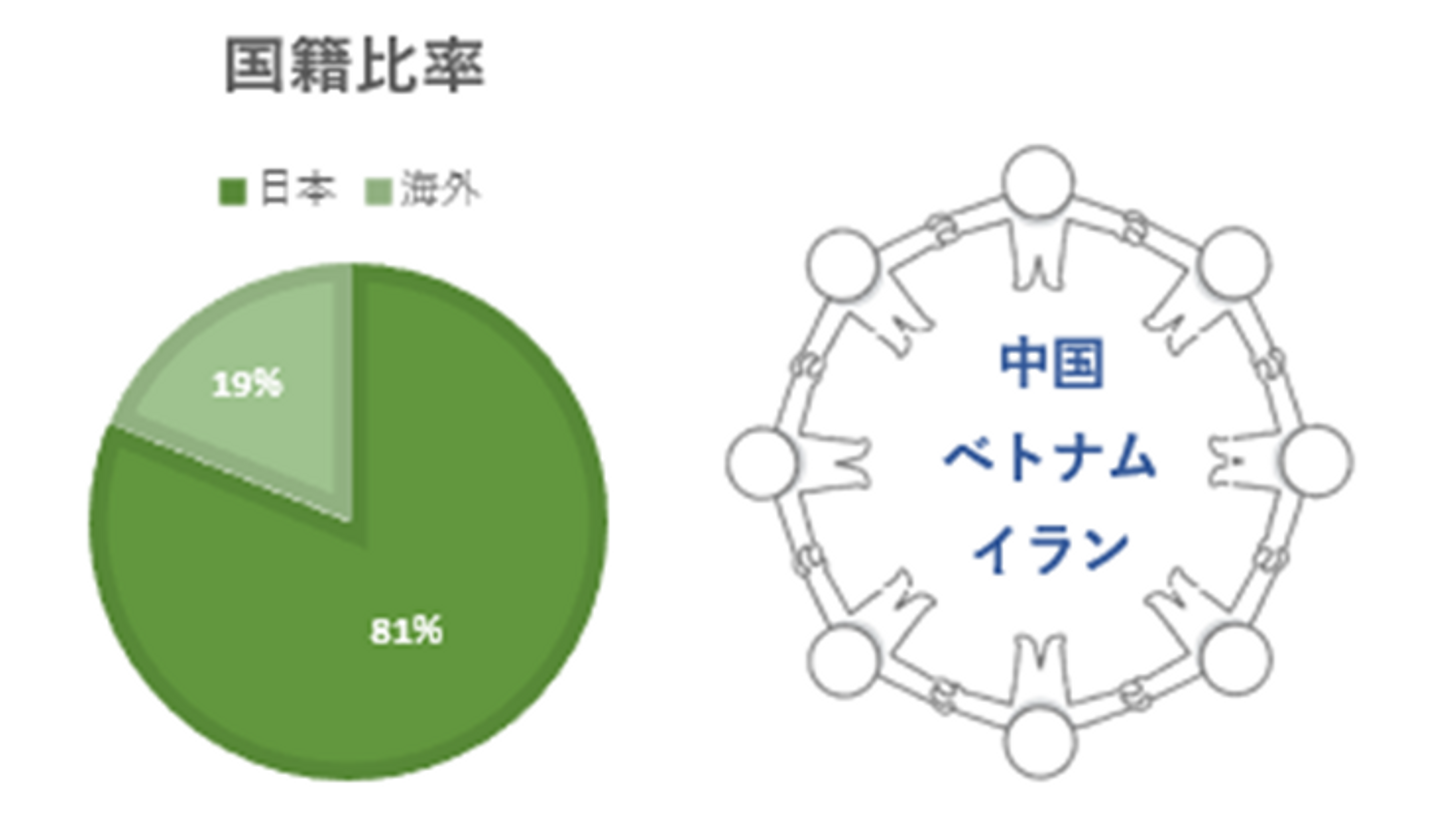 ヒラソルには様々なバックグラウンドを持った人が集まっています。中国出身CEOのみならず、メンバーの19%が外国籍社員です。社内用語は日本語ですが、英語でのコミュニケーションが多く、時に中国語が飛び交います。