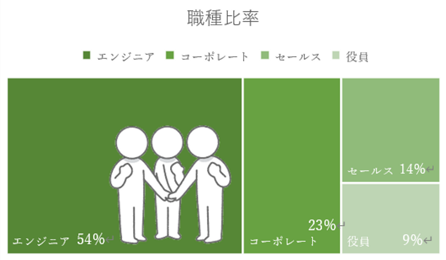 エンジニアグループが過半数を占めており、次いでコーポレートグループ、セールスグループとなっております。それぞれの職種が責任を持ってお互い助け合いながら業務に取り組んでいます。また、使いたい言語や参加したいプロジェクトがあれば気軽に相談できますので、自分の挑戦したいことを応援してくれる会社です。