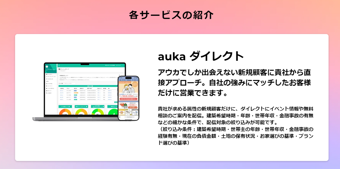 このような環境下で、住宅購入検討者の負担を極限まで軽くし、住宅会社が新規顧客を獲得できるようになるか。そこで、私たちが生み出したのが「aukaダイレクト」なのです。