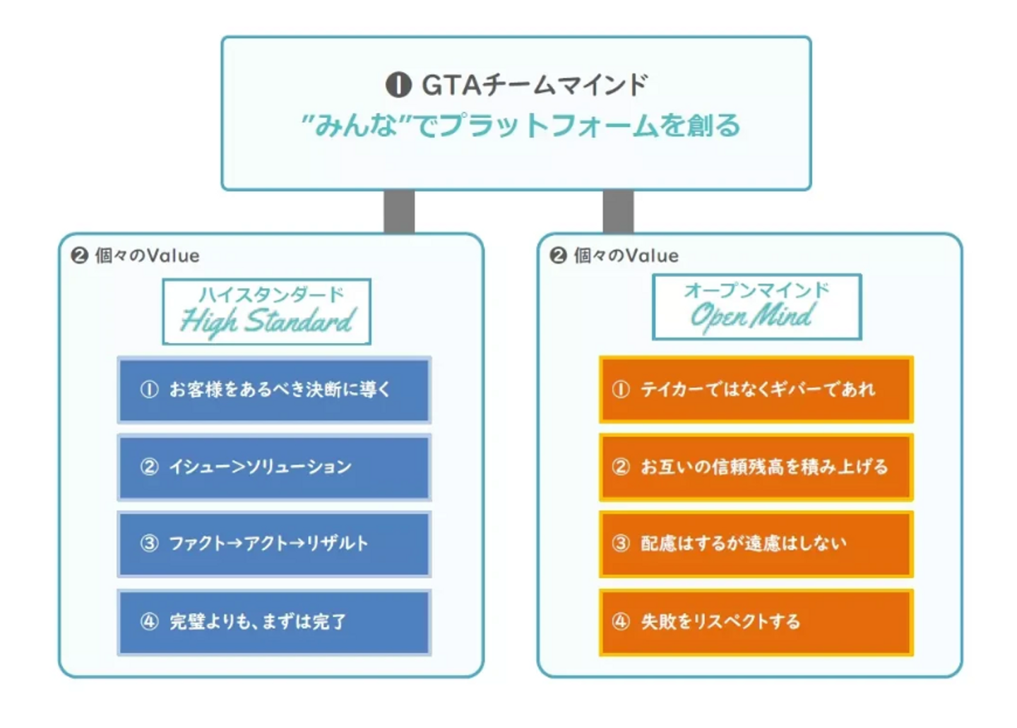 ギバーテイクオールには8つの個人バリューがあり、「オープンマインド」と「ハイスタンダード」の2軸に分けられる