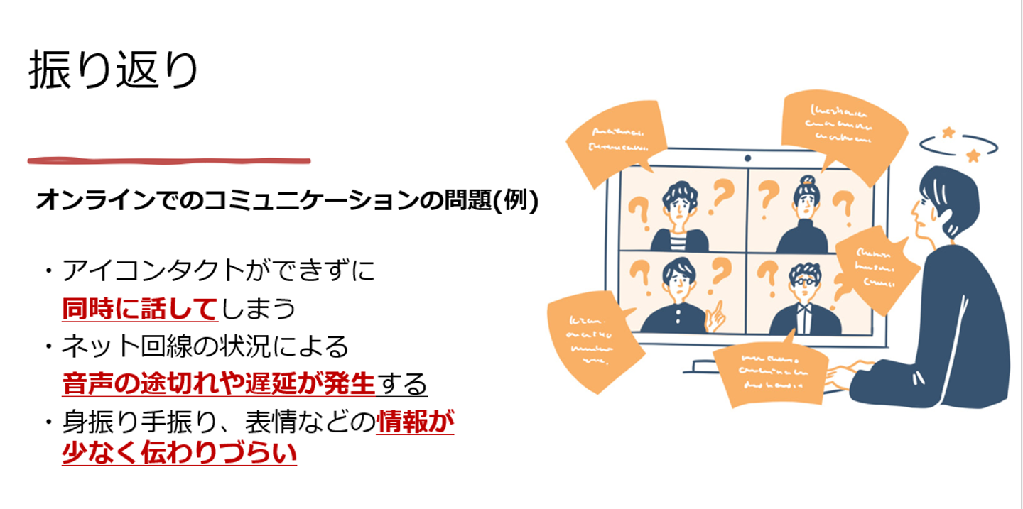 「言葉(音声)だけで情報を伝えるのは難しいことを体感し、画面共有やジェスチャーの重要性を感じた。」