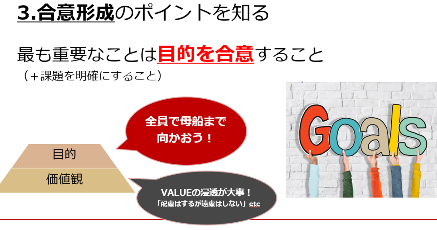 「まずは目的の合意が大事だとよく分かった。スタートがしっかりできると、その後の話し合いがスムーズにできることを実感できた。」