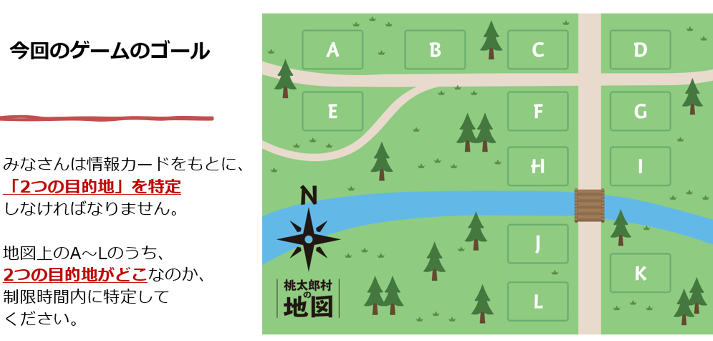 「桃太郎村の地図」はオンラインならではのコミュニケーションのポイントを学ぶために行った協力型ゲームです。