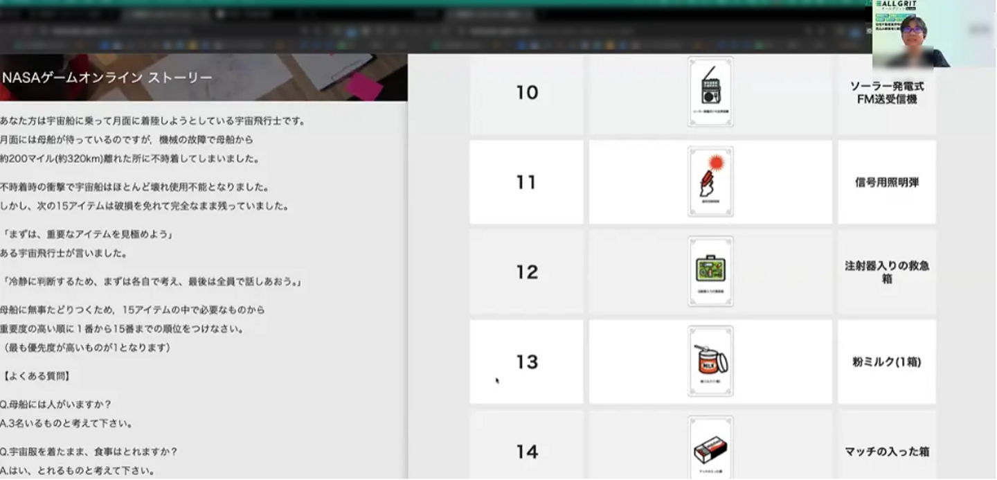 この中でも、議論の前提として、メンバー間で「目的の合意」ができていないと意見が食い違ってしまいます。NASAゲームでは、目的が共有されることで、その後の議論がスムーズに進むことが実感できました。