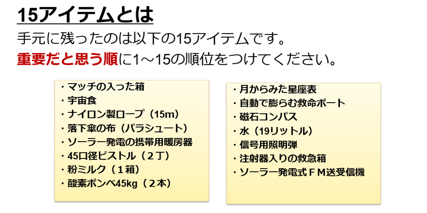参加者は月に不時着した宇宙飛行士という設定で、320km離れた母船に戻るために、手元に残った15個のアイテムの優先順位を決めていきます。