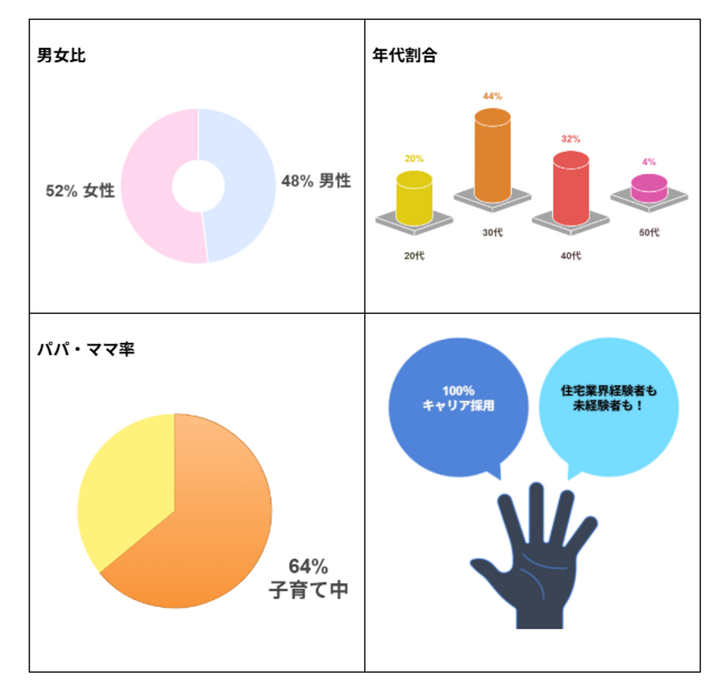 ギバーテイクオールの社員構成は男女比がおおよそ半々で、20代から50代までの幅広い世代のメンバーが活躍しています。