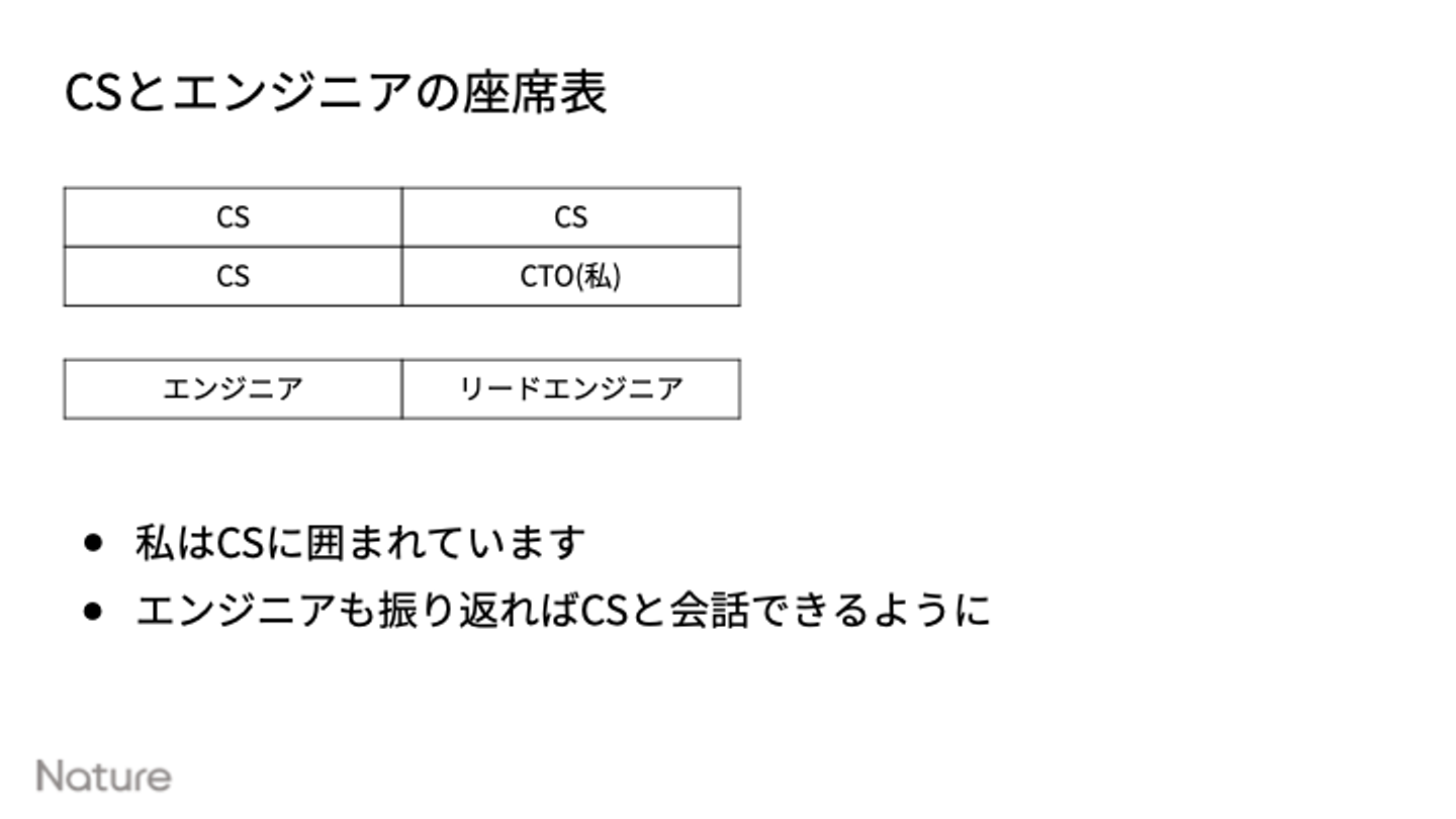 前提としてNatureはアプリやシステムは常に更新しており、その中で大切にしているのはユーザーのフィードバックをプロダクトに反映するということです。もちろん不具合に迅速に気付くためという側面もありますが、プロダクトをよくするためにはCSとの対話が重要です。多少オーバーヘッドがあってもコミュニケーションを厚くすることでカバーしています。