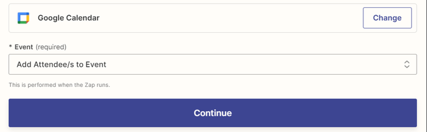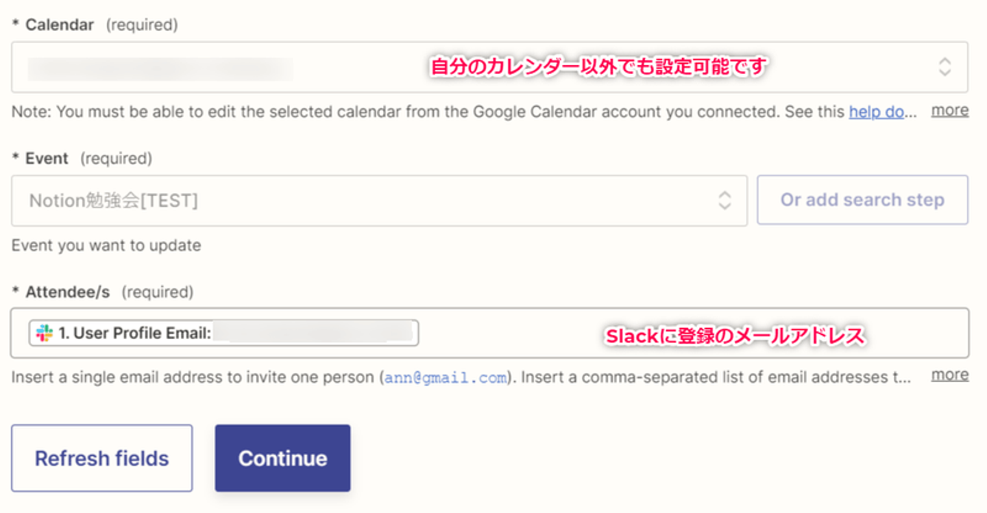 次に、事前に作成していたGoogleカレンダーに招待をしていく設定です。