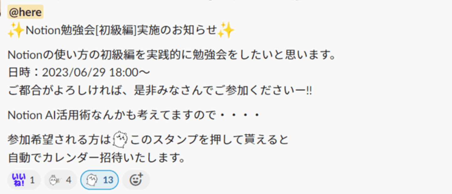 - Slackで流した参加案内に対して、参加のスタンプがついたら