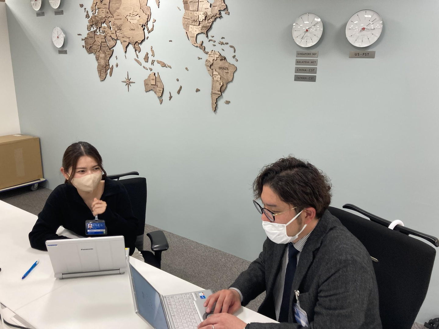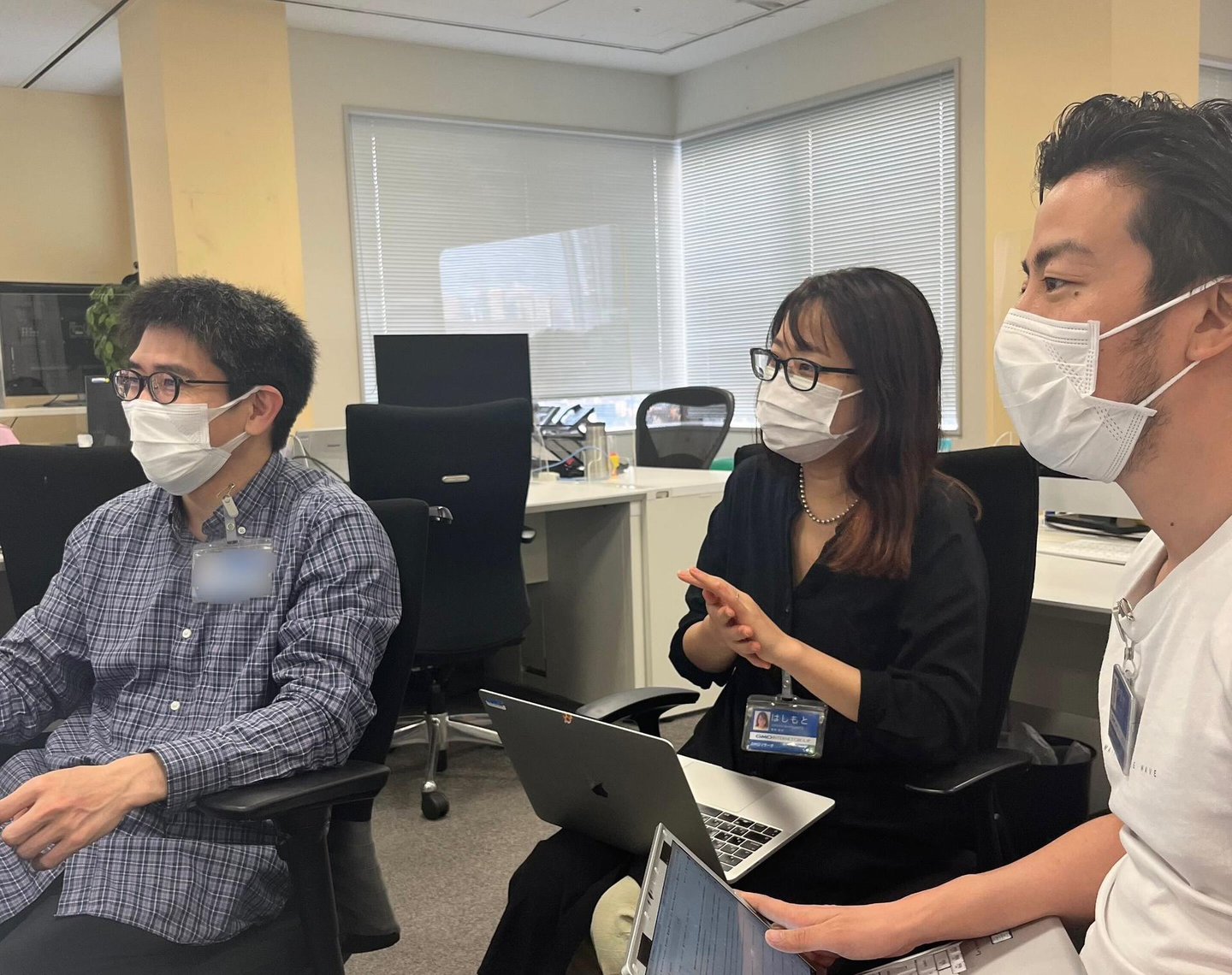 《ミーティング中の橋本さん(中央)。ミーティング中はいつも笑い声が聞こえてくるくらい楽しそうに仕事をされています笑》