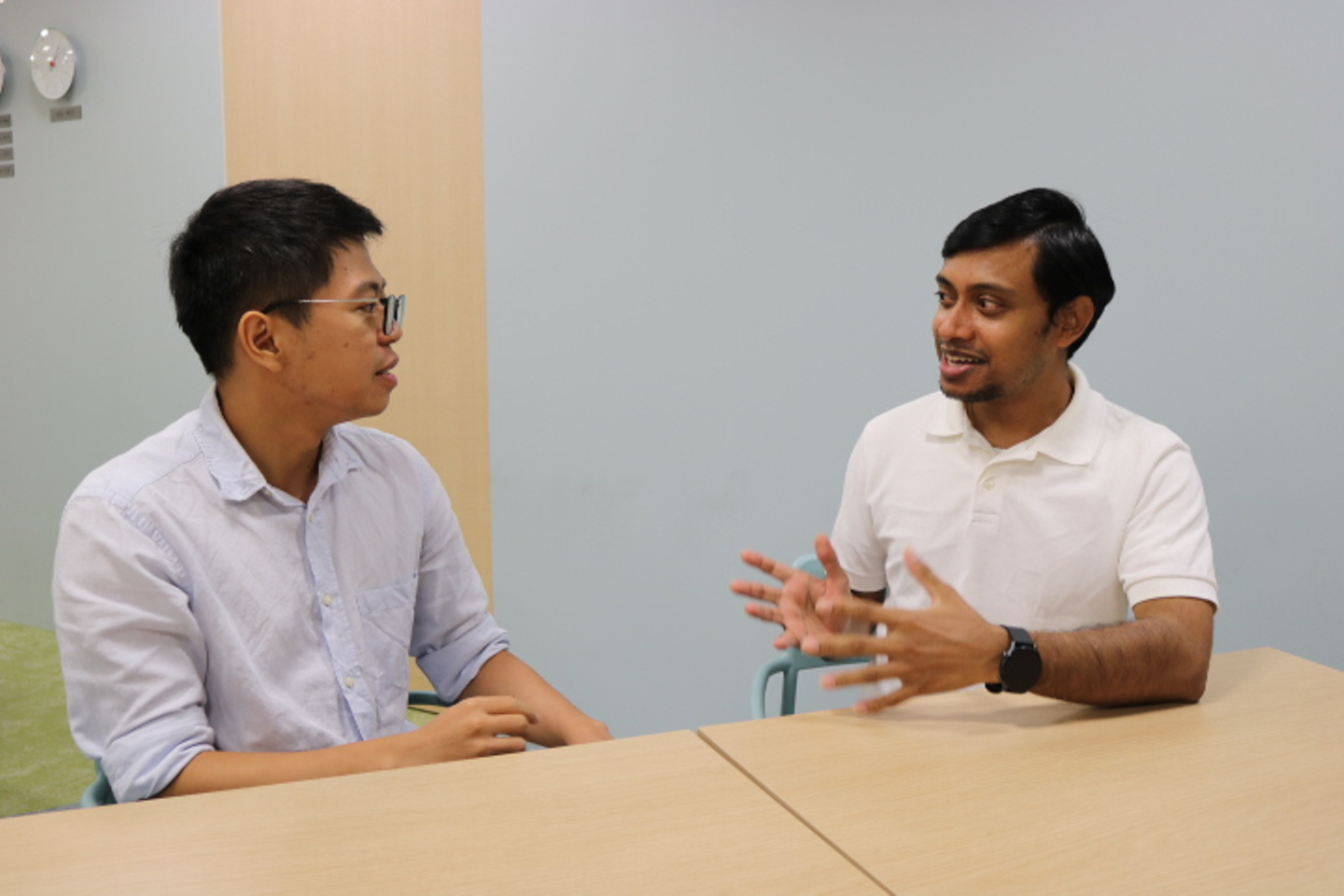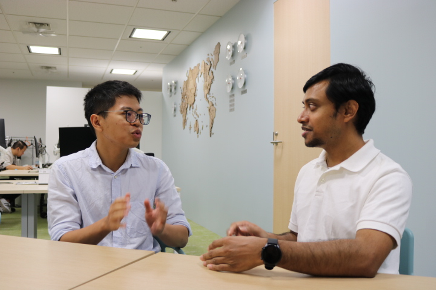 シャリフさん(右):バングラディシュ人。大学時代と新卒の会社で日本人と触れ合ったことをきっかけに日本に興味を持ち来日し、2019年11月にGMOリサーチに入社しました。今はWebエンジニアとして、効率的なアンケート調査を目指すべく、API連携を用いたシステム間の連携を主に行っています。