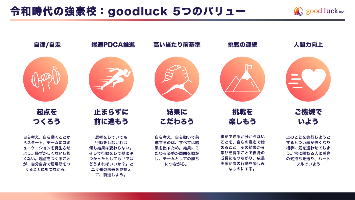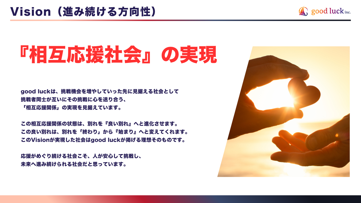 私たちは『good luckを通して関わる方々と、相互応援関係になり、お互いに挑戦(新たな始まり)を応援し合える状態を目指す』という意味を込めて、経営理念・ロゴにこの言葉を入れました。