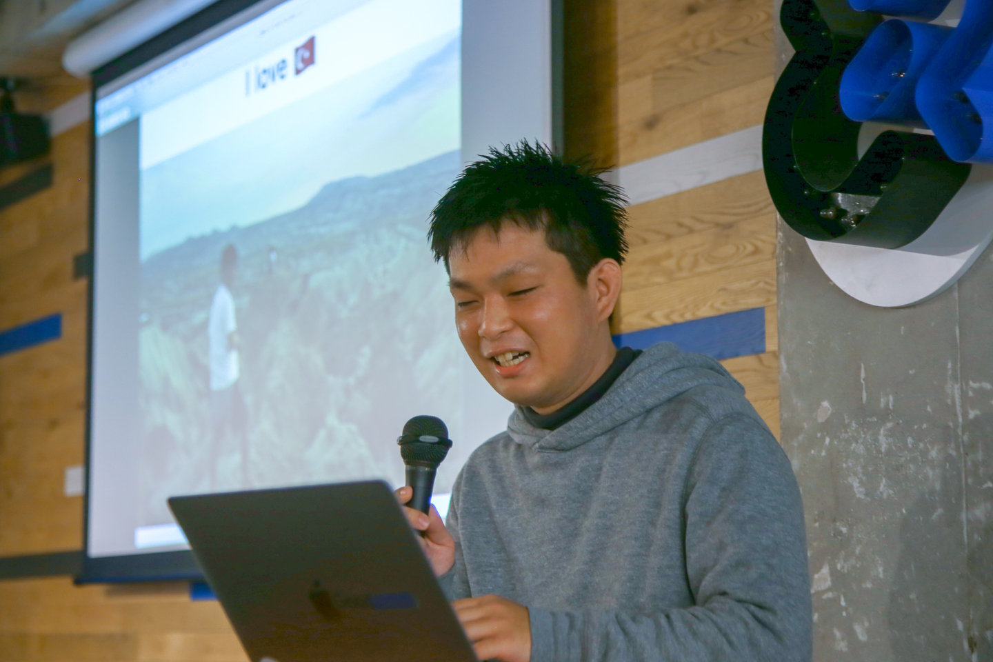 PMとして入社した彼の自己紹介では、「トルコが大好きなので、同じ趣味の人がいたら仲良くなりましょう!」という型破りな挨拶から始まり、「小学生の頃から、デザインに携わる職につくことが夢だったので、今日一つ夢を叶えることができました!」と、社員としてとても嬉しい言葉を聞くこともできました。会場からは、拍手が起こっていましたよ!