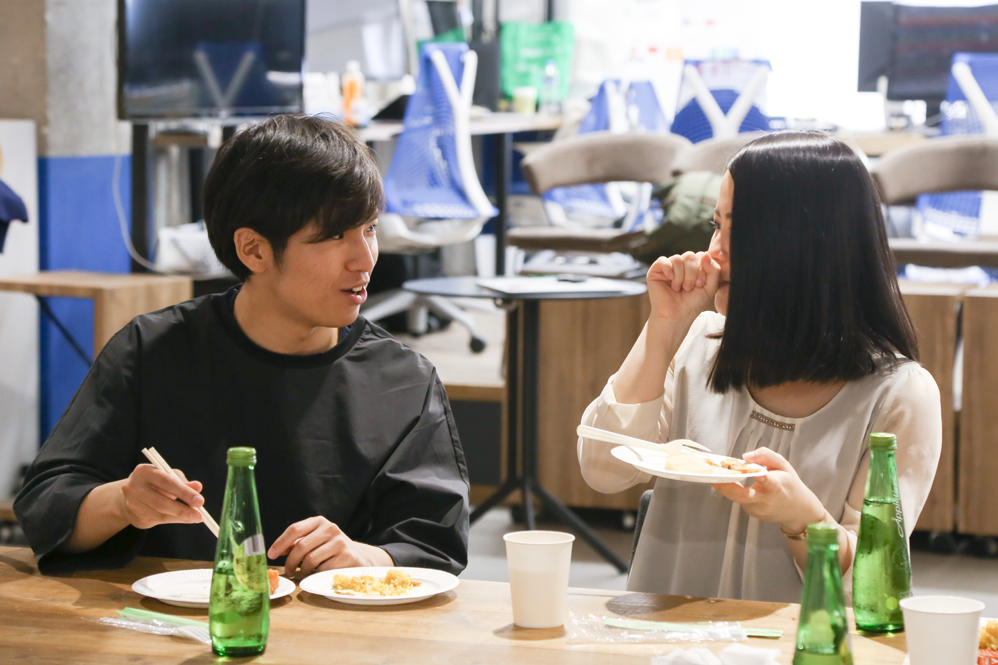 オープンスペースを使ってご飯を食べながら、自己紹介のプレゼンにフィードバックをもらったり、これから始まる研修について質問をしたり、メンター自身が新卒だった頃を振り返ってみたりと、あっという間に時間が過ぎていきました。