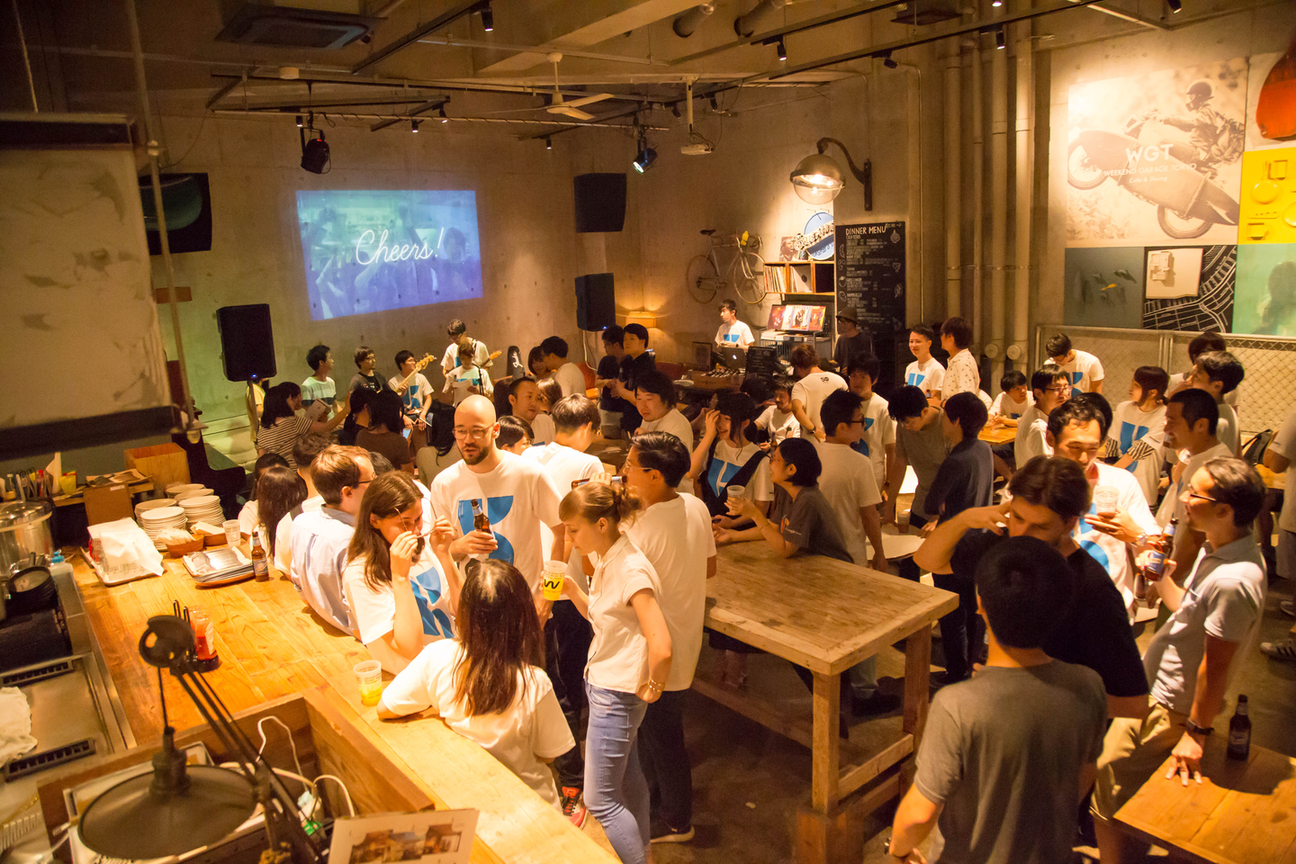 こちらの写真は、昨年の全社総会のアフターパーティーの様子です。全社総会では5周年を記念し、クールなオリジナルTシャツを作成しました!社内のデザイナーがデザインしてくれたこのTシャツは、多くの社員が当日着てくれました。